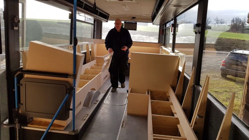 In einer gut koordinierten Aktion nahm die Möblierung im Heck des Gelenkbusses Form an. Jetzt sind nur noch kleinere Nacharbeiten und Detailanpassungen erforderlich.